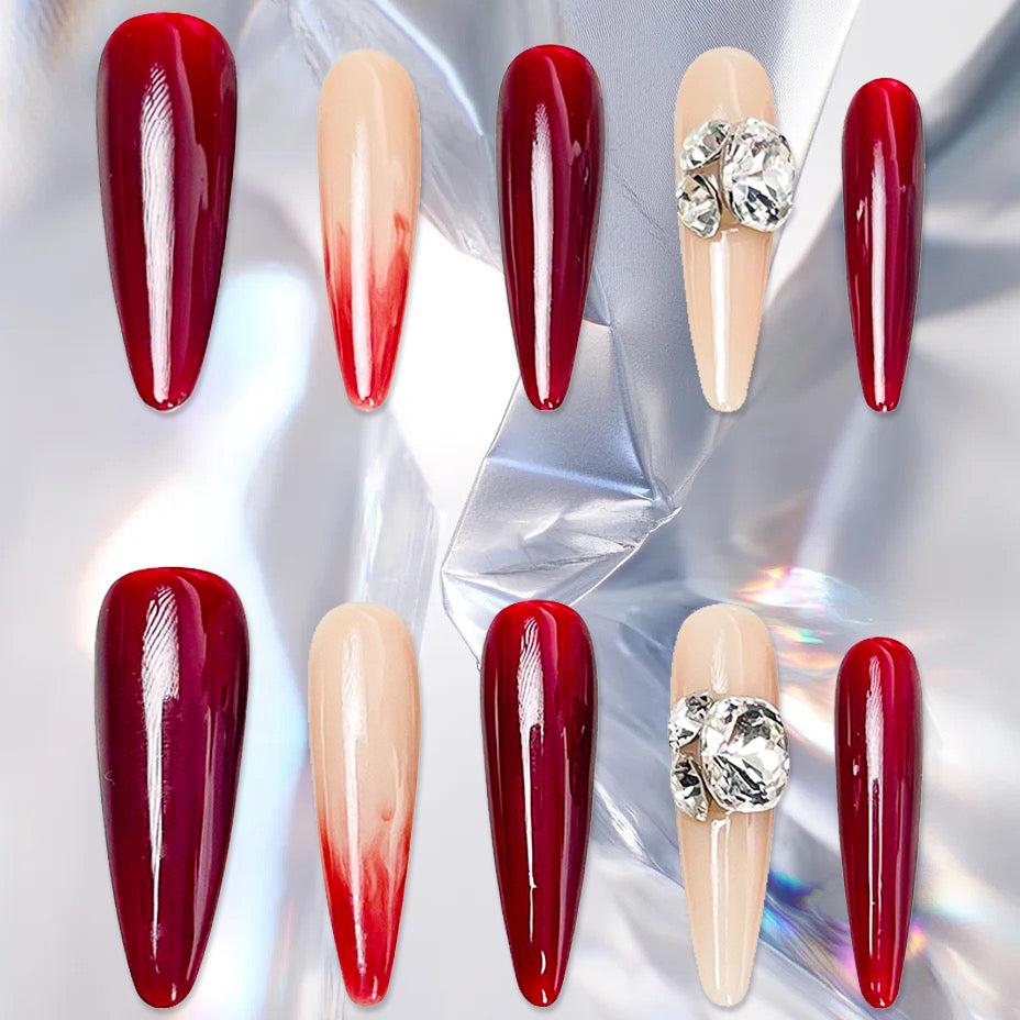 This manicure features a long almond-shaped design that combines classic red and nude skin tones for a stylish yet elegant look. The combination of red and nude skin tones gives the fingertips a softer and more natural look without losing the glamor of brightness. Each fingertip reveals a sense of sophistication, especially when embellished with a *Stacked Diamond*, adding to the overall luxury. A special *red gradient* is designed between the index fingers, which is as natural and smooth as a red wine stain, adding a touch of tenderness and romance to the whole. Suitable for those fairies who love simplicity without losing the delicacy, so that you can easily attract attention on any occasion.