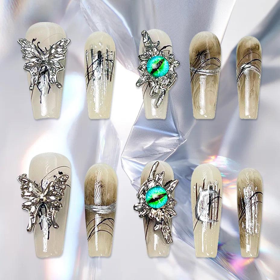 This manicure is based on an icy skin tone, creating a fresh and pure texture. The black color is dyed in the center in a circular pattern, as if it were misty smoke spreading out on the fingertips, adding a sense of mystery and deep layers. The nail surface is embellished with delicate silver foils and black lines outlining, showing the elegance of the fingertips like an artistic painting. A silver butterfly ornament rests lightly on the nail and is accented with a unique green eye, giving the whole design a more dynamic and cool look. Whether it's for everyday or special occasions, it's easy to show off your unique personality and taste.