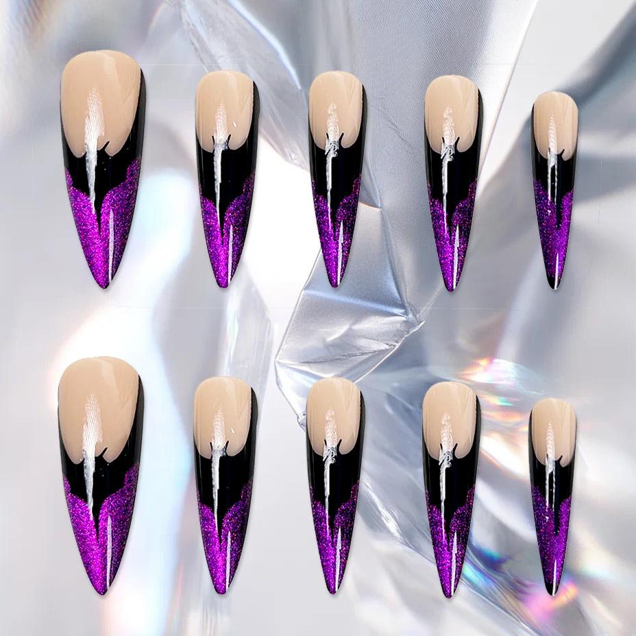 This unique nail art design is divided into three sections, perfectly blending *the nude skin color*, *the purple cat's eye* and the mysterious *black bat* pattern. The *Nude Skin Tone* at the top shows natural elegance, while the *Purple Cat's Eye* French Fingertips add a touch of mystery to the whole. The *Black Bat* motif in the center acts as a guardian of the night sky, connecting the top and bottom sections perfectly and displaying a Halloween-themed charm.
