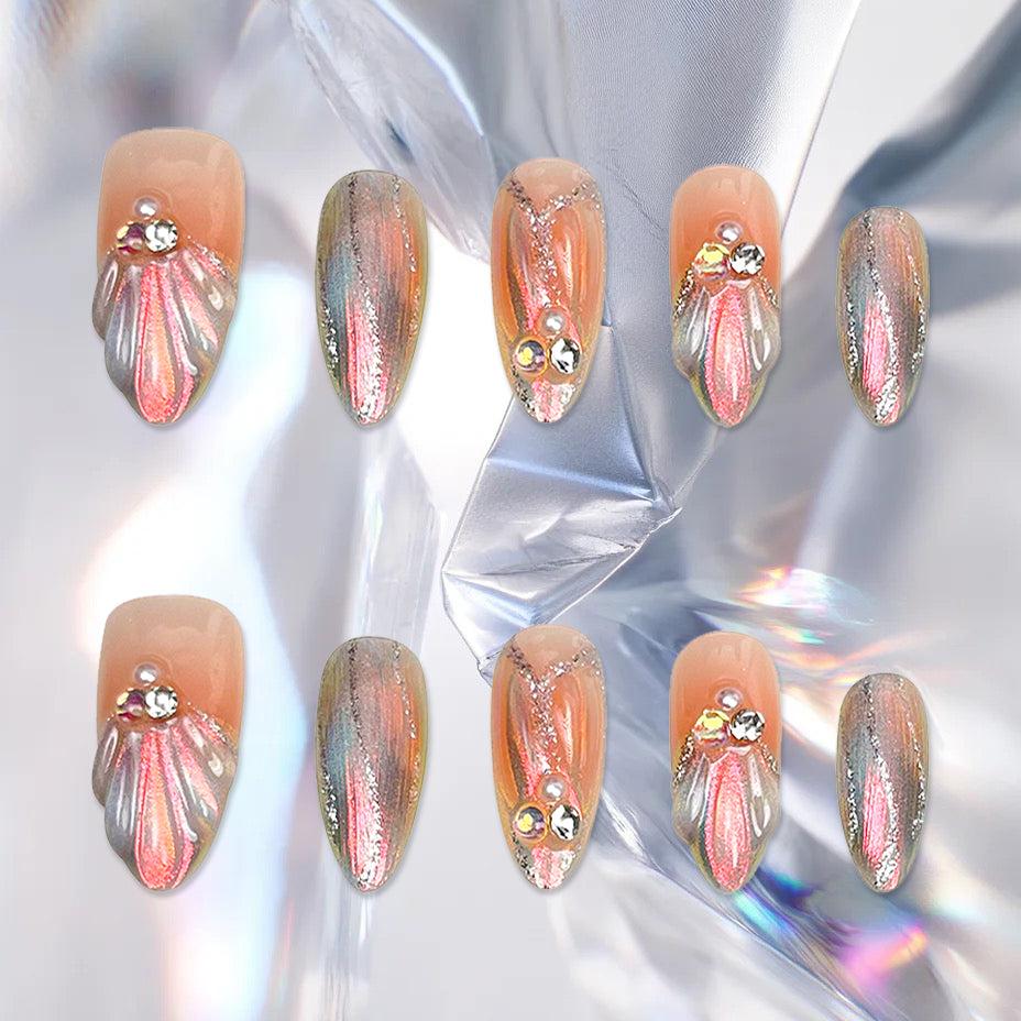 This manicure is based on *Iced Translucent Milk Tea Pink*, with the shimmering effect of *Colorful Magic Mirror Pink*. The overall design is a *Medium Length Almond Nail*, which makes the fingertips appear more slender and elegant. The nail surface is delicately embellished with *Pearls* and blended with *Dimensional Sea Wave Patterns*, making you feel like you are in a mermaid's dream world. Every time the light is refracted, you can see the colorful glow, as if the mermaid girl is dancing lightly on the sea. This nail art is both romantic and mysterious, perfect for those of you who pursue fairy and dreamy style
