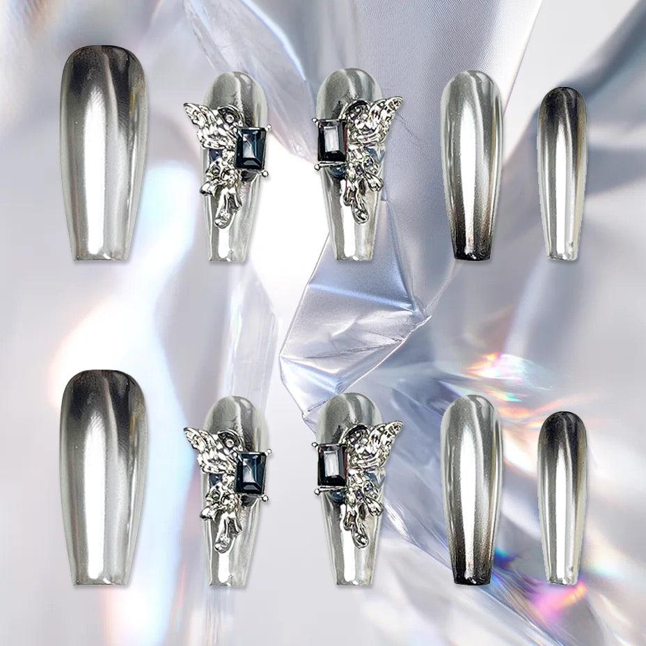 This nail art is based on silver magic mirror powder, presenting a shiny metallic luster like a mirror, mapping out a sense of the future and a sense of fashion. The half-butterfly wings are delicately embellished, bringing light and dynamic visual effects, and the black diamonds inlaid on the wings add a touch of mystery and a sense of luxury. Sparkling silver and deep black diamonds reflect each other, bringing rich visual enjoyment to the whole manicure, which is the perfect choice for trendsetters who pursue individuality and elegance
