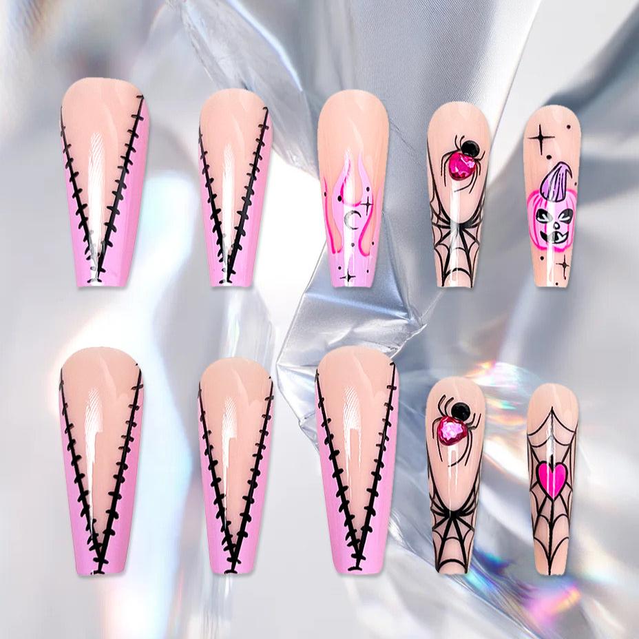 *Mystic Twilight Halloween* is a nail design with a mysterious vibe, featuring a pink base with accents of taro purple, giving it a soft but dark vibe. The *Cracked Pattern* on the nail surface is like a mysterious crack torn from the night, while the *Cobweb* and *Spider* motifs add a bit of Halloween atmosphere to this design. The *Pumpkin Man* embellishment is a festive interpretation of the festive atmosphere and is a personalized manicure not to be missed this season