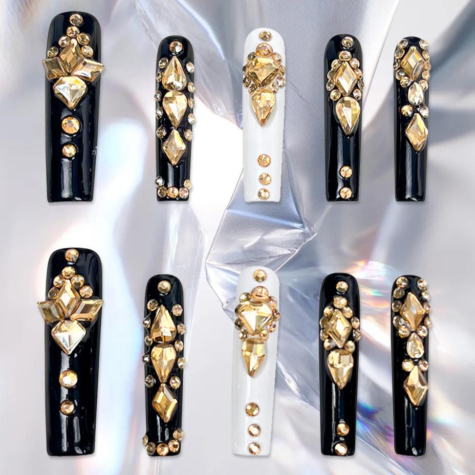 This manicure combines the classic color scheme of *Black* and *White*, and each nail is embellished with delicate *Golden Diamonds*, as if the luxury and mystery of Ancient Egypt were perfectly displayed. The light of the diamonds complements the deep color tones, bringing the elegance and luxury of an Egyptian queen, and every gesture you make while wearing it seems to speak of an ancient legend and noble taste
