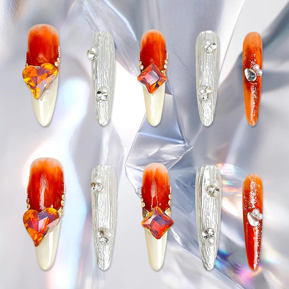 This manicure uses *Sunset Orange* as the base color and *Cream French* to create a warm sunset-like glow that is both gentle and stylish. The *Silver Texture* design adds layers and sparkle to the manicure, making it a surefire way to attract attention at parties. In addition, the delicate decorations of *Sunset Orange Heart Diamonds*, *Small Diamonds* and *Pearls* add a sense of splendor to your fingertips, making you the brightest presence at any party occasion