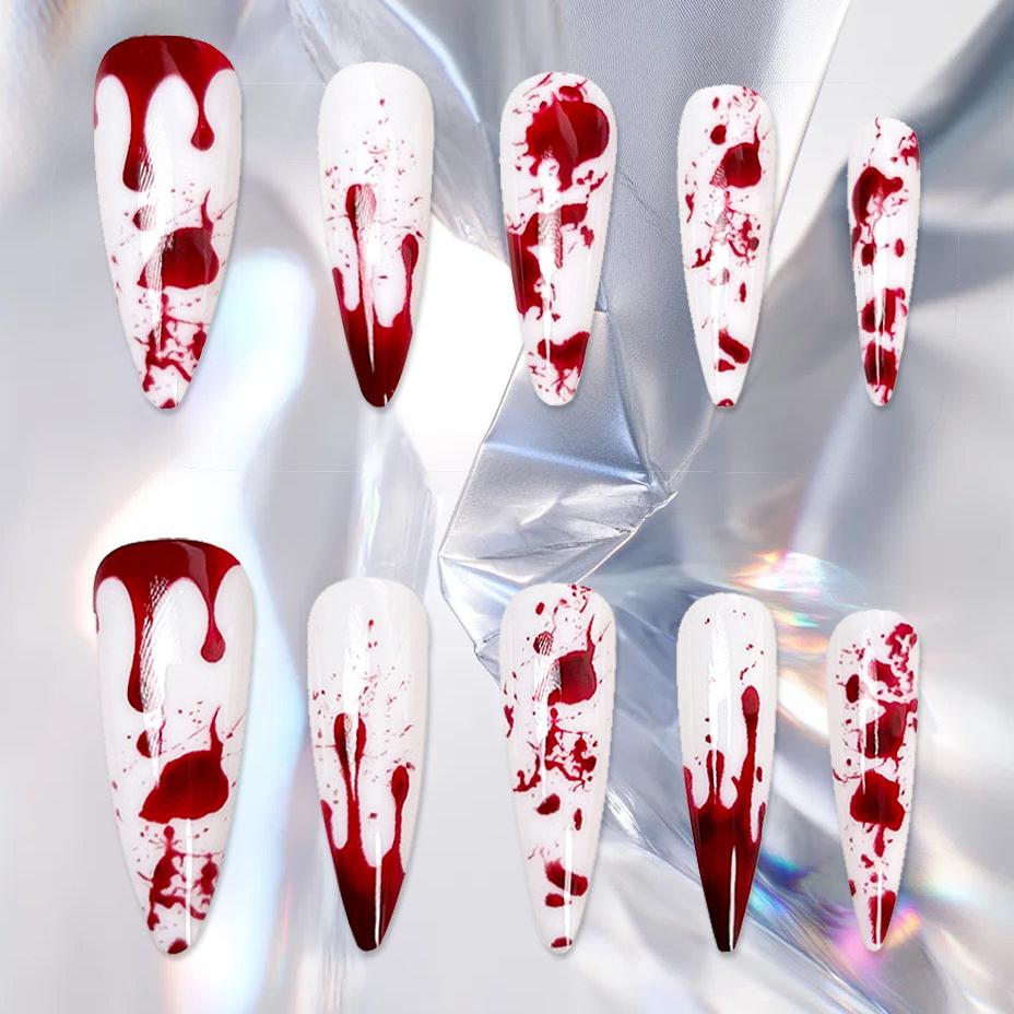 *The Vampire Diaries* is a nail design full of mystery and thrill, with *white* as the base color and *red droplet print*, as if blood is splattered on the fingertips, making it visually stunning. This *long almond-shaped* manicure not only modifies the shape of your hands but also carries a strong sense of Halloween atmosphere. Whether at a party or with friends, *Blood Charm* will make you the center of attention and show off your unique personal style!