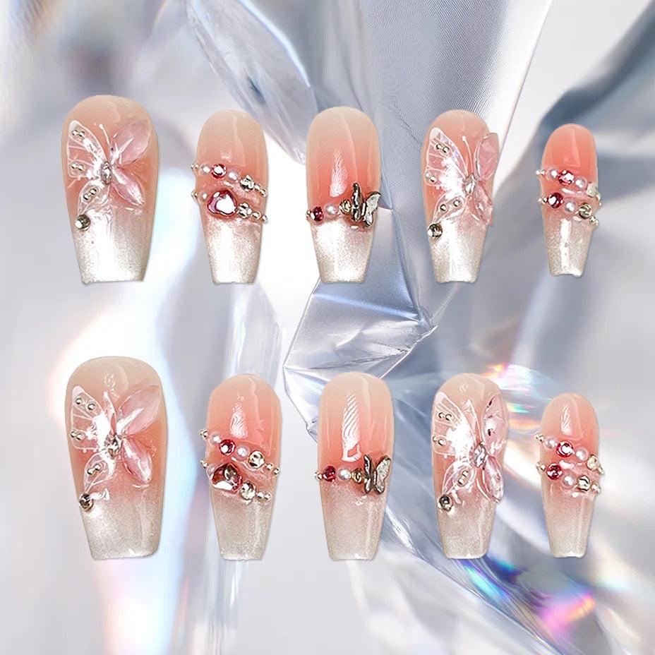 This manicure uses *Ice Translucent Blush* as the main color and is a *Medium Length Trapezoidal Nail* design, which is sweet with a sense of romance. The bottom of the nail surface is specially added with *Silver Cat's Eye Gradient*, which shimmers with a dreamy luster in the light, making the overall look more fairy-like. Each nail is embellished with a *clear bow* and *small diamonds*, of which the bow is particularly special: it is made of a combination of *dimensional butterfly decorations* and *hand-painted butterfly wings*, with the texture of a *thin as a cicada's wing*, which presents the image of a spirited butterfly perfectly. It is a perfect eye-catcher for everyday and special occasions